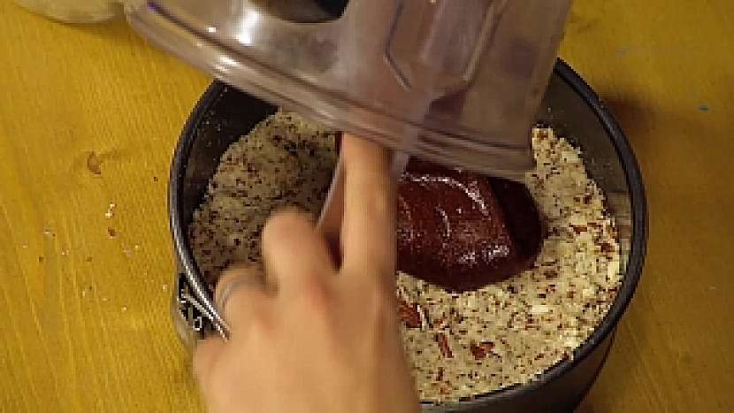 Na korpus použijeme mandle a datle, obojí rozmixujeme dohladka a pevně upěchujeme na dno dortové formy.
