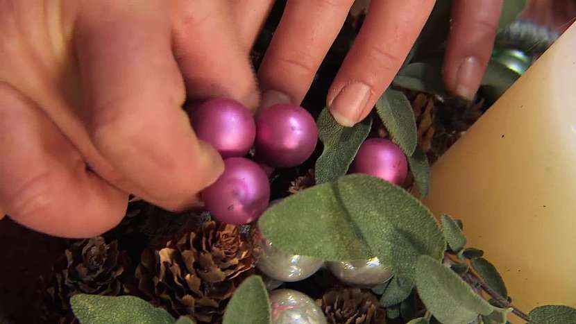Velkou svíčku upevníme na drát, který zapíchneme do aranžovací hmoty a poté okolo rozmístíme šišky, mech, jmelí nebo jehličí a doplníme ozdobami v barvách zelené, růžové a fialové. Vše přilepíme tavnou pistolí.