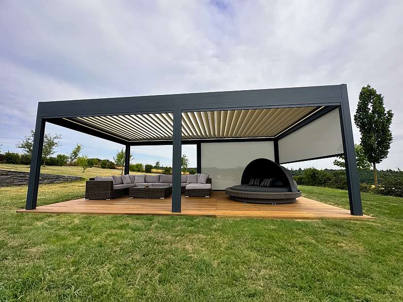 Zásadní roli hrají u bioklimatické pergoly naklápěcí hliníkové lamely ve střeše, které umožňují regulovat množství světla, stínu i proudění vzduchu. Lamely se otáčejí, takže lze plynule nastavit, kolik slunce do prostoru pronikne a jak intenzivně bude prostor větraný. Když je horko, lamely se otevřou a prostor se přirozeně větrá. Když začne pršet, lamely se zavřou a vytvoří nepropustnou střechu, která odvádí vodu do integrovaného odvodnění v konstrukci. Díky tomu pergola reaguje na počasí a pomáhá udržovat komfortní podmínky bez nutnosti aktivního chlazení nebo jiných energeticky náročných řešení. Moderní systémy navíc často doplňují senzory na déšť, vítr nebo slunce, takže se pergola může automaticky přizpůsobit aktuálním podmínkám. Výsledkem je vlastně venkovní obytný prostor, který funguje od jara do podzimu – a při správném vybavení často i celoročně.